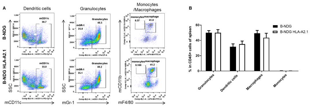 从B-NDG小鼠和B-NDG HLA-A2.1小鼠(n= 3,6周龄,雌性)分离脾细胞。流式细胞术分析脾细胞以评估白细胞亚群。结果表明:纯合B-NDG HLA-A2.1小鼠树突状细胞、粒细胞、单核细胞和巨噬细胞的百分率与B-NDG小鼠相似,表明人源化的B2M和HLA-A2.1不改变这些细胞在脾脏的整体发育、分化和分布。数值用平均值±SEM表示。