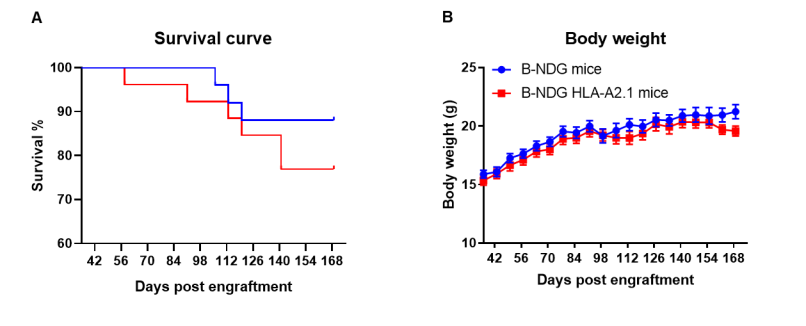 将人CD34+造血干细胞分别植入经0.8 Gy辐照过的B-NDG HLA-A2.1新生小鼠和B-NDG小鼠。(A) B-NDG HLA-A2.1小鼠存活率略低于B-NDG小鼠,但差异无统计学意义。(B)体重。