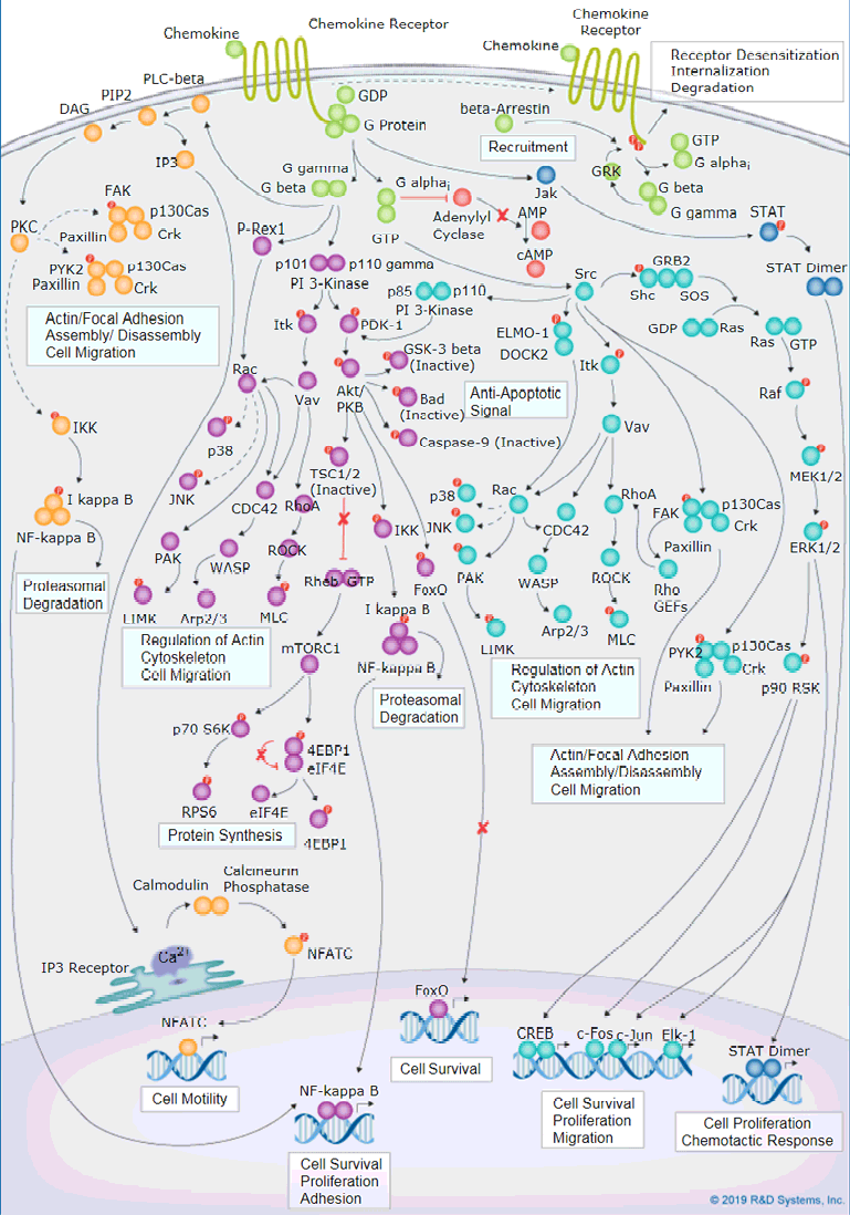 趋化因子受体表达于细胞表面,是与G蛋白偶联的7次跨膜蛋白,趋化因子就是与受体结合后传递细胞信号的,故受体根据其结合的趋化因子亚家族来命名,如 XCR、CCR、CXCR、CX3CR 等。这些受体负责调控多条细胞信号通路,如调动肌动蛋白聚合、细胞骨架重排、粘着斑组装和解聚,此外也在细胞存活等生命活动中发挥着重要作用。