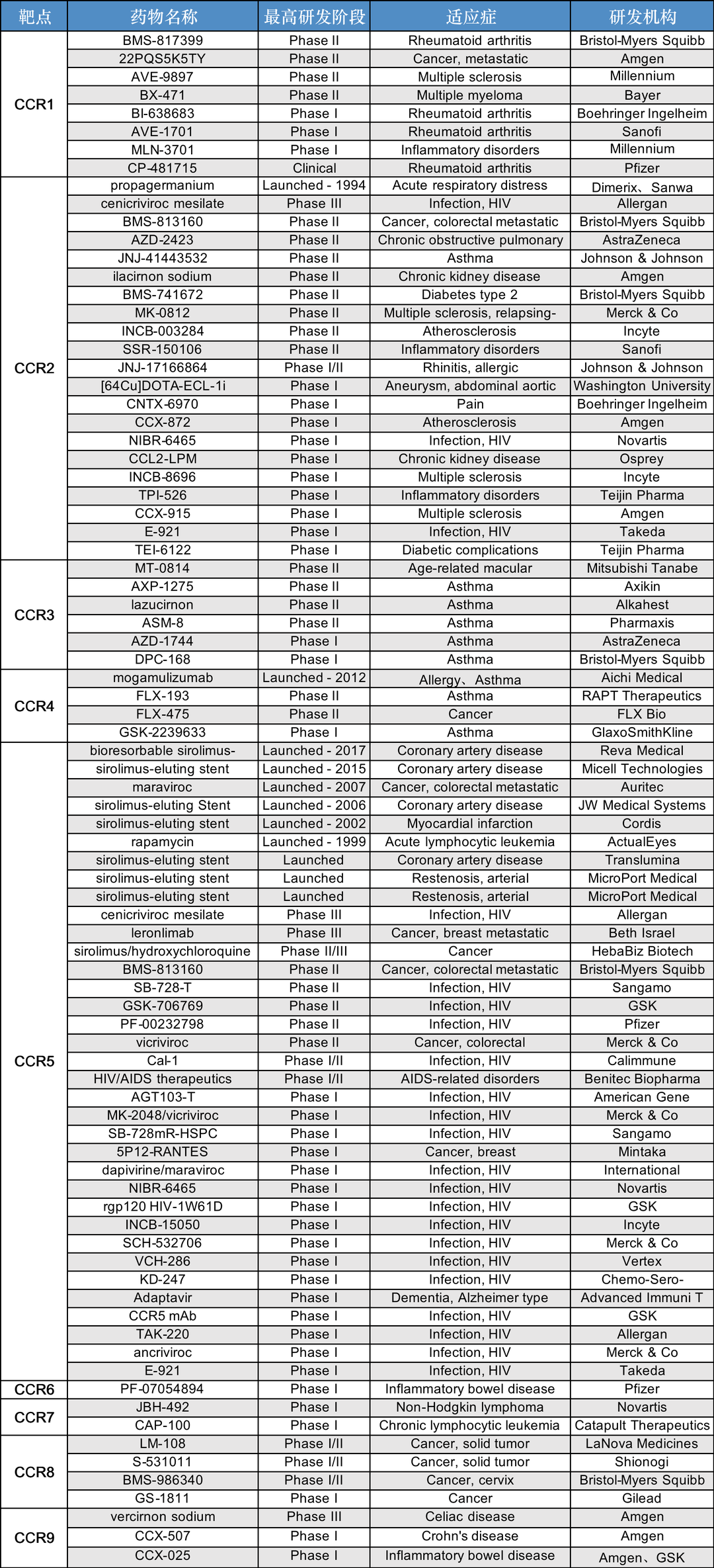 目前,国内外已有多家药企开启了针对趋化因子及其受体的药物开发,其中临床已批准的靶向趋化因子的药物包括:2012年上市的抗CCR4抗体(Mogamulizumab)和2007年上市的CXCR4拮抗剂(Maraviroc)等,用于治疗恶性血液瘤。此外,还有更多的针对不同趋化因子受体-配体轴作为癌症治疗策略的多种努力,这些治疗策略目前已表现出巨大的潜力,正处于临床开发中。