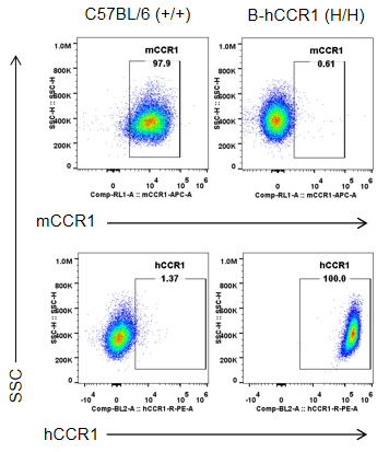 通过流式细胞术检测野生型C57BL/6和纯合B-hCCR1小鼠中CCR1的蛋白表达。收集野生型C57BL/6和纯合B-hCCR1小鼠的腹腔巨噬细胞,并用种属特异性抗CCR1抗体进行流式细胞术分析。结果显示:鼠CCR1仅在野生小鼠中检测到,人CCR1仅在纯合B-hCCR1小鼠中检测到。