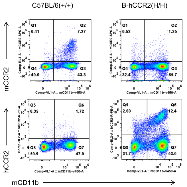 通过流式细胞术检测野生型C57BL/6和纯合B-hCCR2小鼠中CCR2的蛋白表达。收集野生型C57BL/6和纯合B-hCCR2小鼠的骨髓,并用种属特异性抗CCR2抗体进行流式细胞术分析。结果显示:鼠CCR2仅在野生小鼠中检测到,人CCR2仅在纯合B-hCCR2小鼠中检测到。
