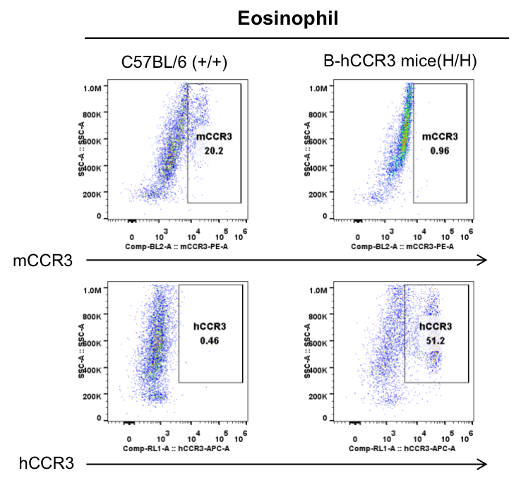 通过流式细胞术检测野生型C57BL/6和纯合B-hCCR3小鼠中CCR3的蛋白表达。收集野生型C57BL/6和纯合B-hCCR3小鼠的骨髓,并用种属特异性抗CCR3抗体进行流式细胞术分析。结果显示:鼠CCR3仅在野生小鼠中检测到,人CCR3仅在纯合B-hCCR3小鼠中检测到。