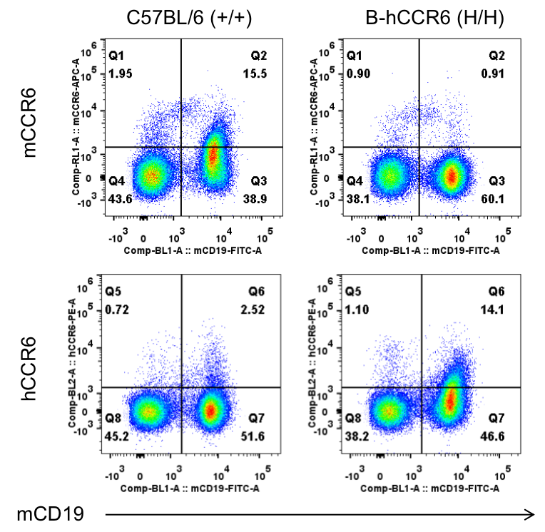 通过流式细胞术检测野生型C57BL/6和纯合B-hCCR6小鼠中CCR6的蛋白表达。收集野生型C57BL/6和纯合B-hCCR6小鼠的脾细胞,并用种属特异性抗CCR6抗体进行流式细胞术分析。结果显示:鼠CCR6仅在野生小鼠中检测到,人CCR6仅在纯合B-hCCR6小鼠中检测到。
