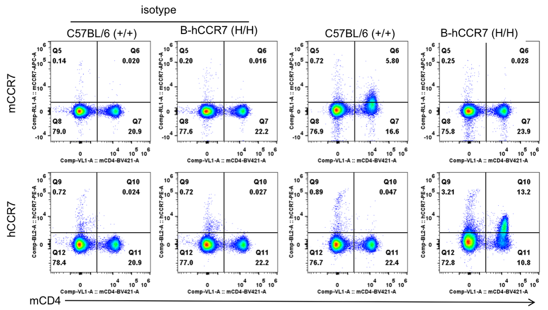 通过流式细胞术检测野生型C57BL/6和纯合B-hCCR7小鼠中CCR7的蛋白表达。收集野生型C57BL/6和纯合B-hCCR7小鼠的脾细胞,并用种属特异性抗CCR7抗体进行流式细胞术分析。结果显示:鼠CCR7仅在野生小鼠中检测到,人CCR7仅在纯合B-hCCR7小鼠中检测到。