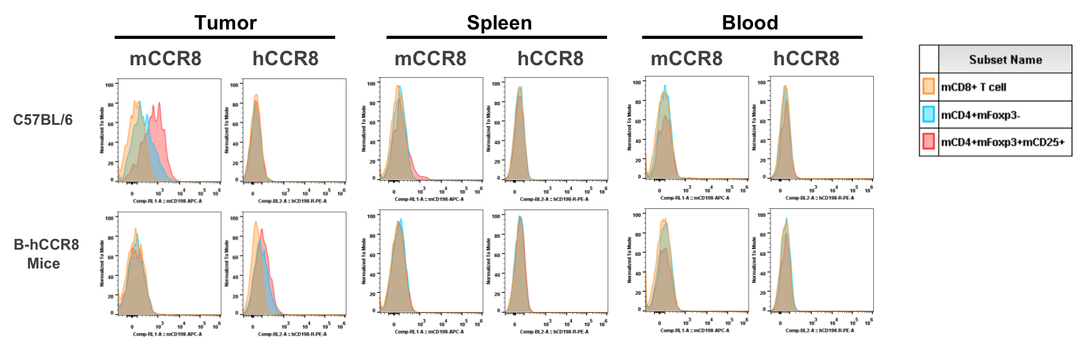 人CCR8在纯合B-hCCR8小鼠肿瘤中CD4+ T细胞和Treg细胞均可检测到,但在脾细胞和血细胞中不能检测到。鼠CCR8在野生型小鼠的肿瘤中可检测到,脾细胞中弱表达,而在血细胞中不表达。