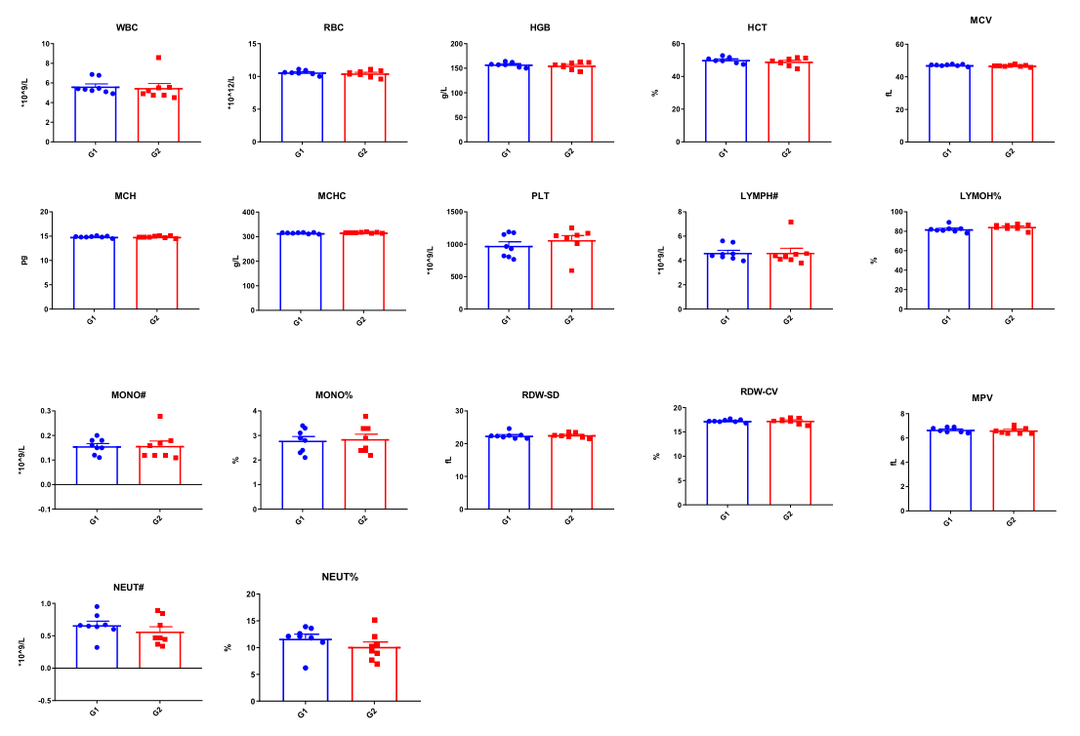 收集野生型C57BL/6和B-hCCR8小鼠的外周血进行血常规检测(n=8,雌性,9周龄),结果显示:B-hCCR8小鼠的各指标与野生C57BL/6小鼠无明显差异,表明CCR8的人源化未改变血细胞的组成及形态。