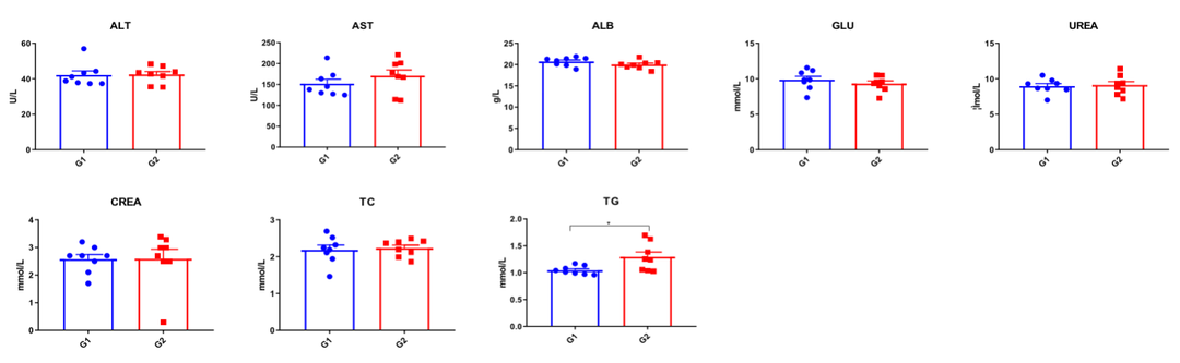 收集野生型C57BL/6和B-hCCR8小鼠的血清进行血生化检测(n=8,雌性,9周龄),结果显示:B-hCCR8小鼠的各指标与野生C57BL/6小鼠无明显差异,表明CCR8的人源化未影响小鼠的肝、肾功能及脂肪代谢能力。