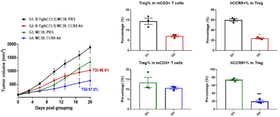 抗人CCR8抗体在B-hCCR8小鼠接种MC38模型和B-Tg(hCCL1) MC38模型中均有较好的抑瘤效果。TILs分析显示:抗人CCR8抗体给药组(G2、G4)与未给药组(G1、G3)相比,总的Tregs和hCCR8+ Tregs的比例显著性降低。