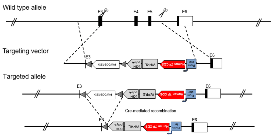 利用基因编辑技术,将鼠源TF基因的3-5号外显子替换为人源TF编码序列,由外源启动子启动人源TF蛋白的表达,同时外源基因的插入导致内源小鼠TF基因的部分缺失,达到鼠源TF蛋白表达缺失的目的,从而构建稳定表达人源TF蛋白的MC38细胞系。