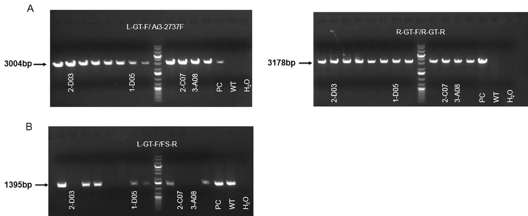 利用L-GT-F/Ai3-2737F、R-GT-F/R-GT-R引物进行PCR扩增外源引入的基因序列并通过测序鉴定引入序列的准确性(A),利用L-GT-F/FS-R引物进行PCR扩增并通过测序鉴定鼠源基因是否敲除(或移码突变)(B),每个克隆经过至少两次的基因型鉴定判定最终结果,结果显示B-hTF MC38细胞系成功敲除鼠源基因,敲进人源目标序列。
