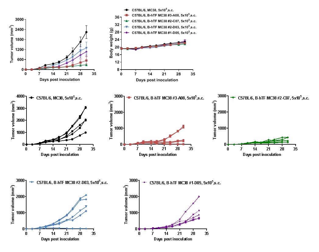 图5. C57BL/6小鼠皮下接种B-hTF MC38单克隆和MC38细胞后的生长动力学及体重变化