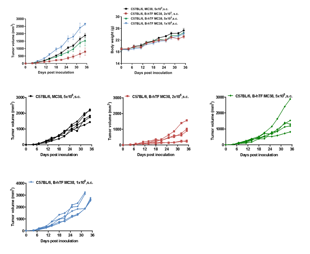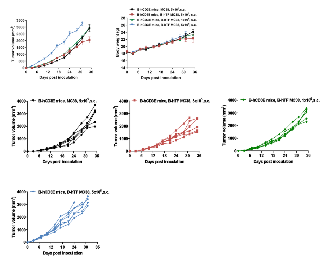 B-hTF MC38人源化细胞系经过基因型鉴定、蛋白水平表达鉴定证明该细胞成功敲除鼠源TF基因,敲进人源TF目标基因,鉴定后的单克隆经过成瘤初筛筛选合适克隆进入复筛以及细胞建库后成瘤验证,证明B-hTF MC38人源化细胞系在C57BL/6小鼠、B-hCD3E 小鼠和B-h4-1BB 小鼠体内成功建立肿瘤模型,综合多次成瘤数据,该细胞系体内接种剂量建议1E6,该模型可用于靶向TF单抗及多抗药物的临床前药效评价。