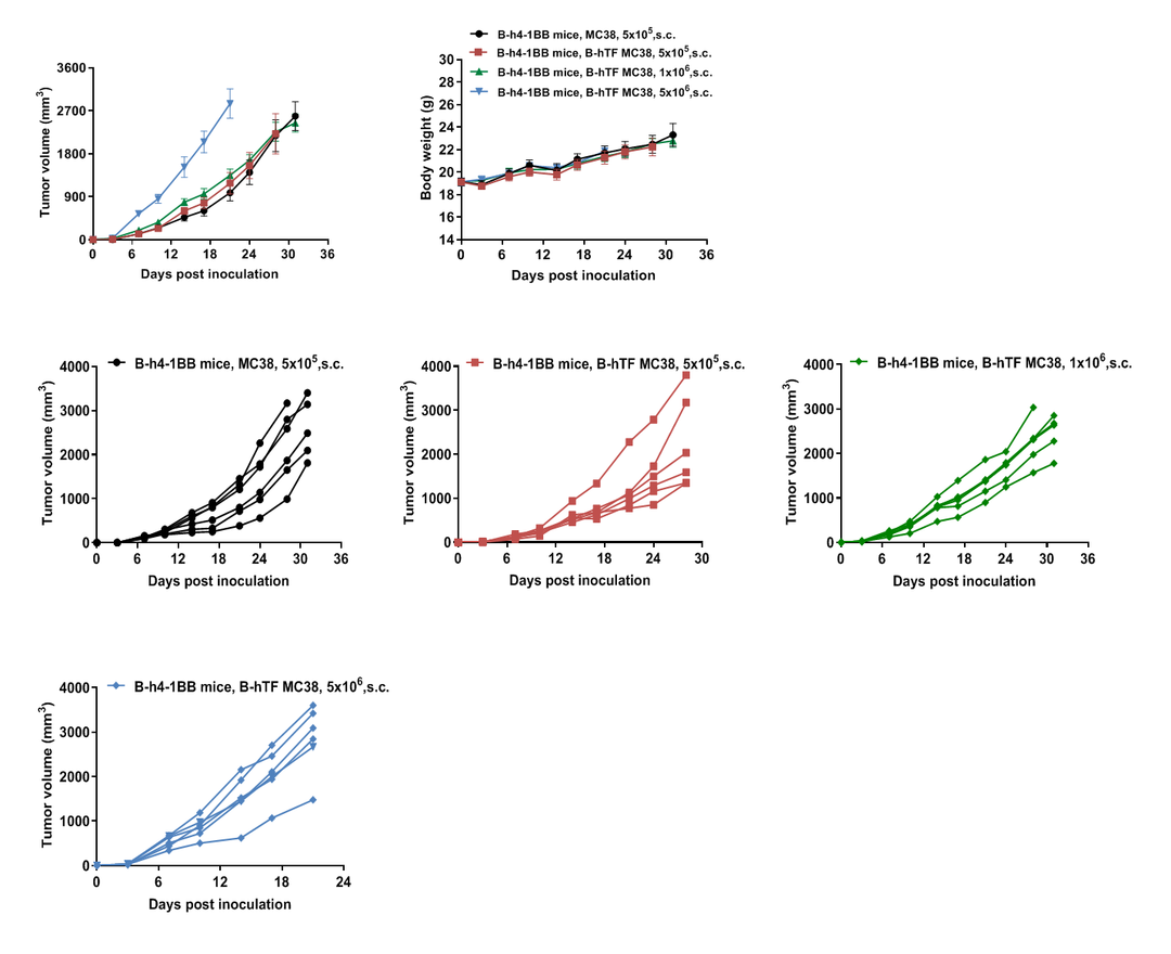 图8. B-h4-1BB 小鼠皮下接种B-hTF MC38和MC38细胞后的生长动力学及体重变化