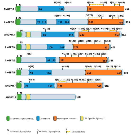 ANGPTL(Angiopoietin-like proteins,血管生成素样蛋白)家族包括8个成员,是分泌型糖蛋白,具有3个保守的结构域,即N端的信号肽、coiled-coil结构域(CCD)和C端fibrinogen-like结构域(FLD);只有ANGPTL8例外,它没有C端的FLD。对于ANGPTL3, 4, 8来说,它们都具有LPL和内皮脂肪酶(EL)的抑制结构域(specific epitope1, SE1)。