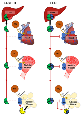 ANGPTL3/8复合物分泌入血,可抑制循环系统、以及氧化组织(如心脏、肌肉)中的LPL活性。喂食状态下,ANGPTL8上调(ANGPTL4下调),使得心脏和肌肉中的LPL活性受ANGPTL3/8抑制,进而使得循环中的TG进入白色脂肪组织(WAT)存储起来。