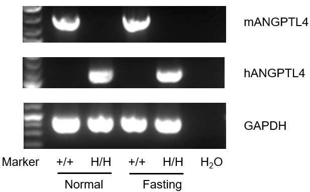 用RT-PCR分析纯合B-hANGPTL4小鼠中ANGPTL4基因的种属特异性表达。mANGPTL4 mRNA的表达仅在野生型小鼠的脂肪组织中检测到,而hANGPTL4 mRNA的表达只在纯合B-hANGPTL4小鼠中检测到,野生型小鼠中检测不到。
