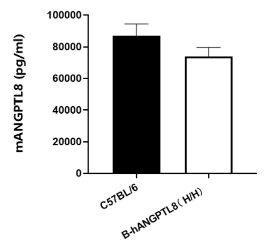用ELISA分析纯合B-hANGPTL8小鼠中ANGPTL8蛋白的种属特异性表达。取野生型C57BL/6小鼠和纯合B-hANGPTL8小鼠的血浆进行ELISA分析。ANGPTL8的表达在两种鼠中均可检测到,因为抗体可种属交叉识别。
