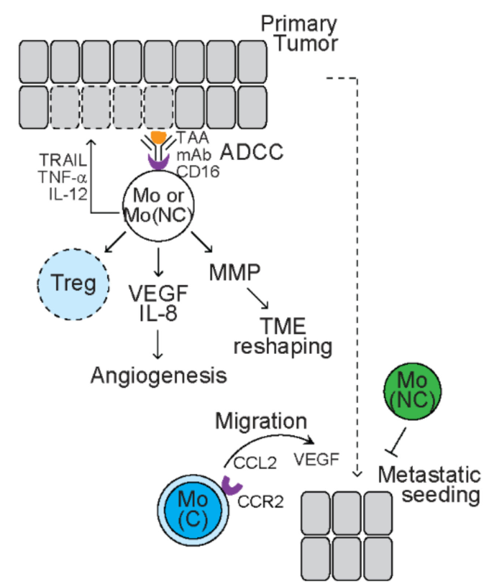从机制上讲,中间型单核细胞经肿瘤细胞刺激后,促炎细胞因子TNF- α和白细胞介素12(IL-12)的产生增加,而抗炎细胞因子白细胞介素10(IL-10)的产生减少,并对肿瘤细胞产生直接的细胞毒性,促进肿瘤细胞凋亡。经典型单核细胞产生VEGF,促进肿瘤细胞外渗,导致转移。相比之下,非经典型单核细胞在吞噬肿瘤细胞衍生微粒后被激活,从而减少肿瘤细胞的转移。