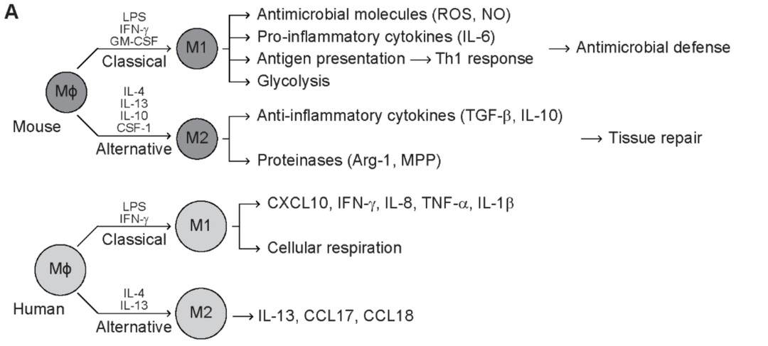 M1巨噬细胞是对抗微生物感染的第一道防线,具有很强的抗原呈递能力诱导强烈的Th1反应。在脂多糖(LPS)、IFN-γ和粒细胞-巨噬细胞刺激因子(GM-CSF)的作用下,M1巨噬细胞经历经典激活,并优先分泌抗菌分子和促炎细胞因子。