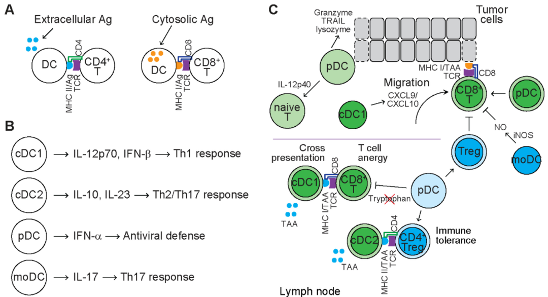 DC是最有效的抗原呈递细胞(APCs),连接先天免疫和适应性免疫,在生理条件下具有表型和功能异质性。在对微生物感染的反应中,细胞外微生物蛋白通常被成熟DC吞噬或内吞,并通过MHC II分子呈递给CD4+ T细胞。相比之下,胞质微生物蛋白通常通过MHC I分子呈现给CD8+ T细胞。TME浸润的DC包括不同发育阶段的树突状细胞亚群,这些肿瘤相关树突状细胞根据不同的细胞亚群和肿瘤分期,发挥免疫刺激或免疫抑制作用。
