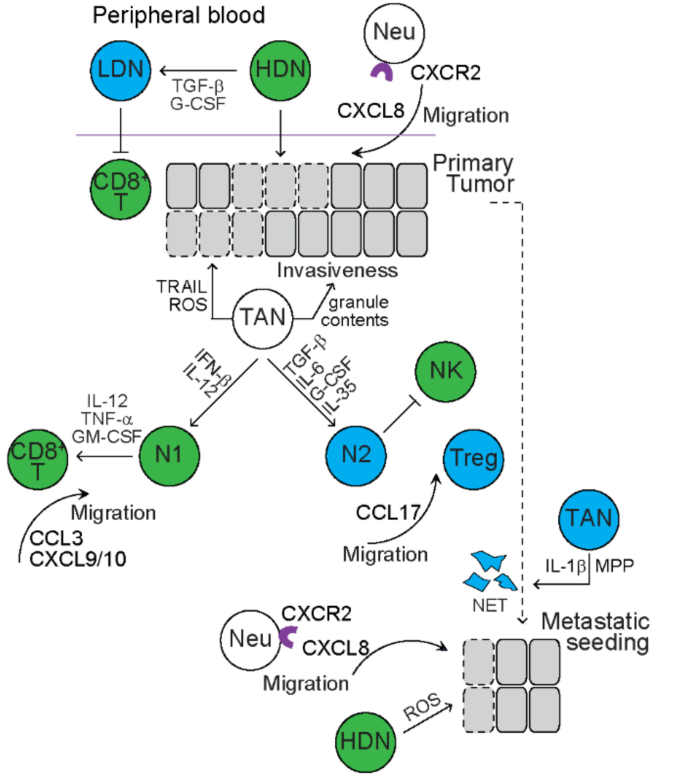 这些与癌症相关的循环中性粒细胞由功能异质性亚群组成,是循环外周血的多形核吞噬细胞,具有对抗微生物病原体的先天免疫功能。在癌症患者中,特别是在晚期和转移后,循环中性粒细胞数量增加,高中性粒细胞与淋巴细胞比率(NLR)与侵袭性癌症相关。