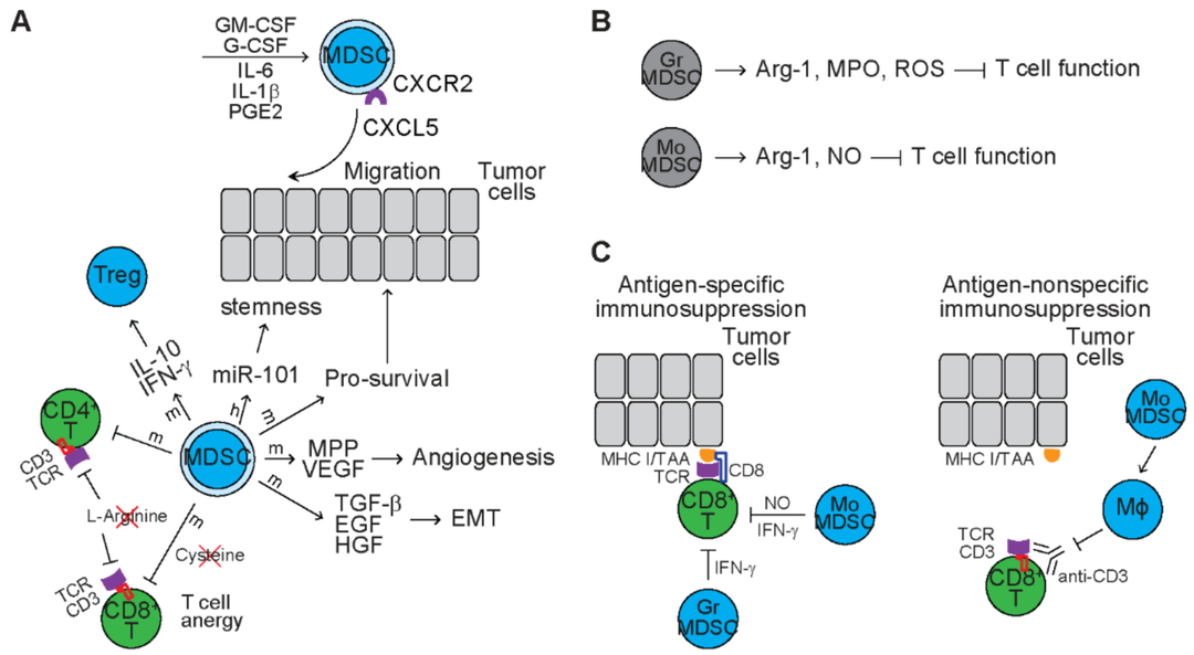 肿瘤相关的MDSC由两个主要亚群体组成,粒细胞骨髓来源抑制细胞(GrMDSCs)和单核细胞骨髓来源抑制细胞(MoMDSCs)。GrMDSCs在表型和形态上与中性粒细胞相似,MoMDSCs在表型和形态上与单核细胞相似,研究表明GrMDSCs和MoMDSCs均参与T细胞介导的免疫抑制。