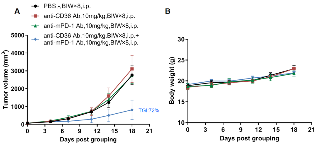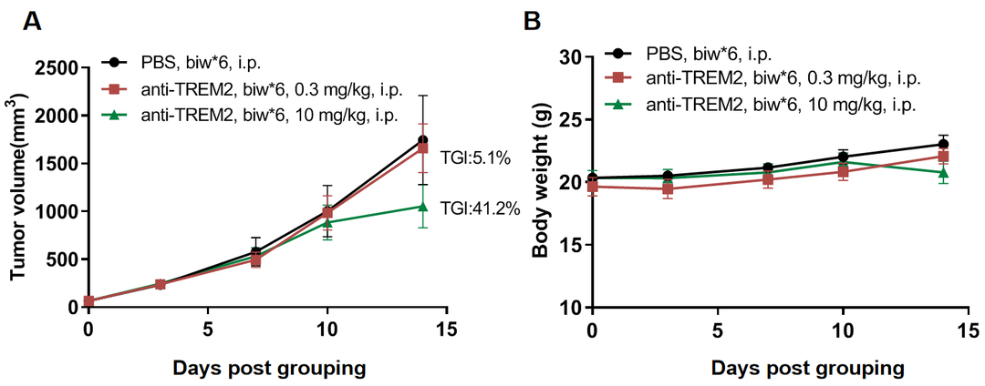 抗人TREM2抗体在B-hTREM2(C)小鼠中的抗肿瘤活性。纯合子B-hTREM2(C)小鼠(雌性,10周龄,n=6)小鼠皮下接种小鼠乳腺癌EMT-6细胞。当肿瘤体积达到约50-80 mm3时,对小鼠进行分组,然后使用抗人TREM2抗体进行治疗。如图A所示,抗人TREM2抗体在B-hTREM2(C)小鼠中有效地控制肿瘤生长,证实B-hTREM2(C)小鼠模型是抗人TREM2抗体临床前体内药效评估的优质模型。数值以平均值±SEM表示。