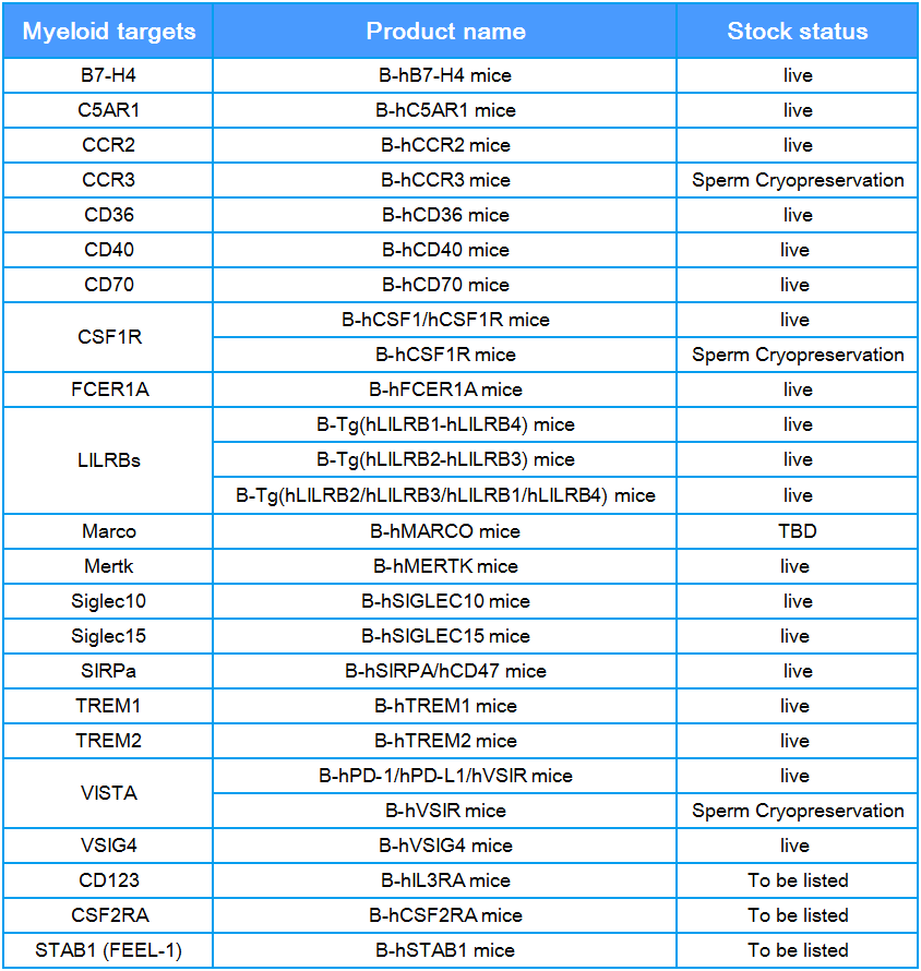 髓系细胞在肿瘤免疫治疗的研究中的作用是毋庸置疑的,调节这些髓系细胞的发育、成熟和功能有助于发现新的肿瘤免疫治疗策略。然而,由于各种可互换亚群的复杂性和可塑性,这些髓系细胞执行重叠或相反的功能,目前控制TAMCs行为的分子机制在很大程度上尚不清楚。为进一步阐明髓系细胞各亚群在不同癌症中的功能,并确定其促肿瘤和抗肿瘤活性相关的分子机制,百奥动物自主研发一些列髓系靶点人源化小鼠,助力深入了解髓系细胞的复杂性,并设计新的肿瘤靶向治疗方法。