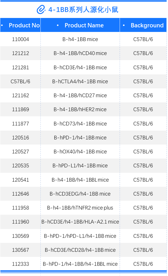 通过众多临床试验及以往多年研究积累,4-1BB 靶点被证实是肿瘤免疫治疗十分有潜力的靶点,目前如何最大化激动作用并最小化毒性是未来4-1BB激动剂研发亟需解决的问题。百奥动物自主研发的4-1BB系列人源化小鼠(详情见下表),是靶向4-1BB抗体开发相关药物进行药效评价的优质模型。