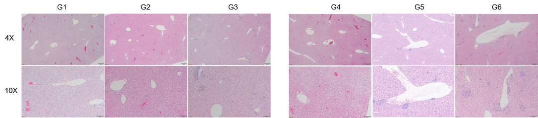 在B-h4-1BB/h4-1BBL小鼠(G4-G6)中,1 mg/kg组(G5) 3/5的小鼠出现病理变化(轻度2/5,轻度1/5),而在20 mg/kg剂量(G6)时,所有实验动物肝脏均出现中度变化。总体而言,20 mg/kg组(G6)肝脏病变程度和发生率显著高于1 mg/kg组(G5)。
