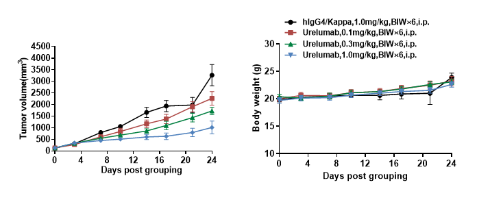 抗人4-1BB抗体在B-h4-1BB/h4-1BBL小鼠中的抗肿瘤药效。(A) 纯合子B-h4-1BB/h4-1BBL小鼠 (雌性,6-8周龄,n=5) 皮下接种小鼠结肠癌MC38细胞系。结果显示抗人4-1BB抗体能够显著抑制MC38肿瘤细胞的生长。(B)治疗期间体重变化。如图A所示,抗人4-1BB抗体在B-h4-1BB/h4-1BBL小鼠中有效地控制肿瘤生长,这表明B-h4-1BB/h4-1BBL小鼠可为体内评价抗人4-1BB抗体药效提供有力的临床前研究模型。值表示为平均值±SEM。