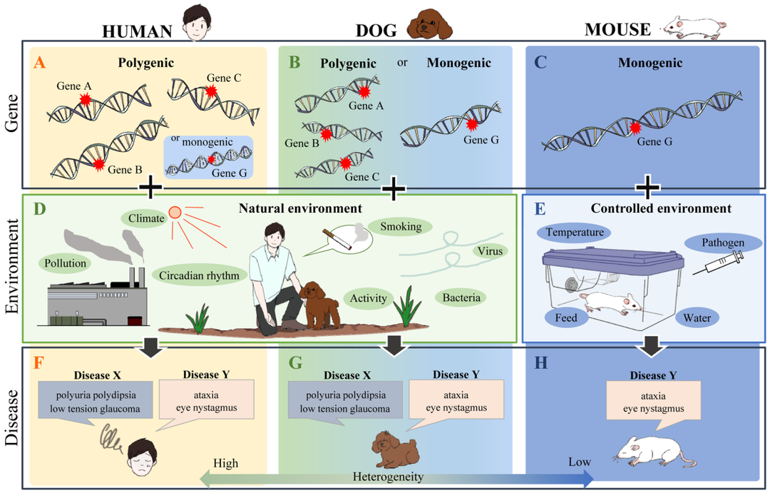 图2. 遗传和环境影响对人类、犬和小鼠疾病的影响