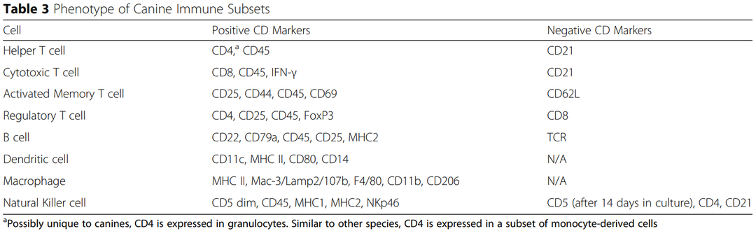 犬的免疫系统与人的免疫系统基本一致,免疫细胞亚型均包括细胞毒性T细胞,辅助T细胞,调节T细胞,B细胞,树突细胞,巨噬细胞,NK细胞等。疾病状态下,免疫应答也保持一致。