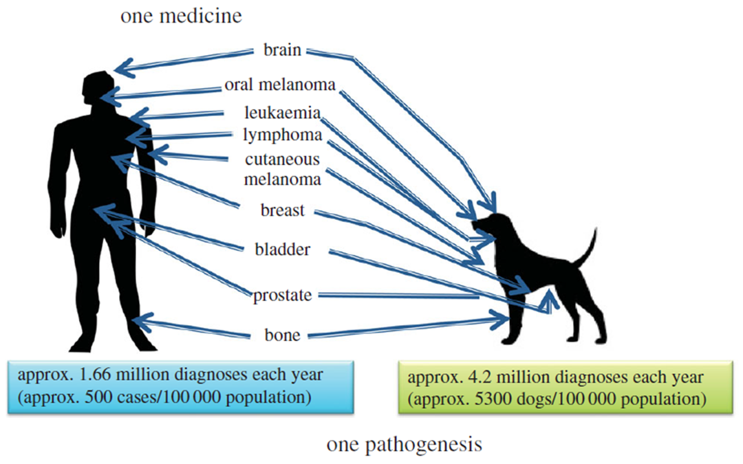 在肿瘤领域,犬自发肿瘤与人类有相似的药物治疗靶点,相似的信号传导通路,对常规疗法的反应或耐药机制以及转移和复发均具有相似性;组织病理学方面,犬和人中许多特定的癌症具有相同的特征(骨肉瘤,粘膜黑色素瘤,非霍奇金淋巴瘤,膀胱癌等);基因表达方面,犬和人的相应癌症之间的基因表达量相似,在转录水平上也表现出相似性。在临床治疗上,对人类有效的多种药物,对犬也同样有效。