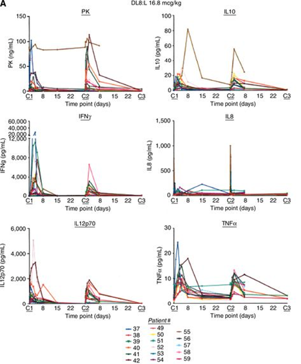 图7. I期临床实验中NHS-IL12治疗后人血清细胞因子变化