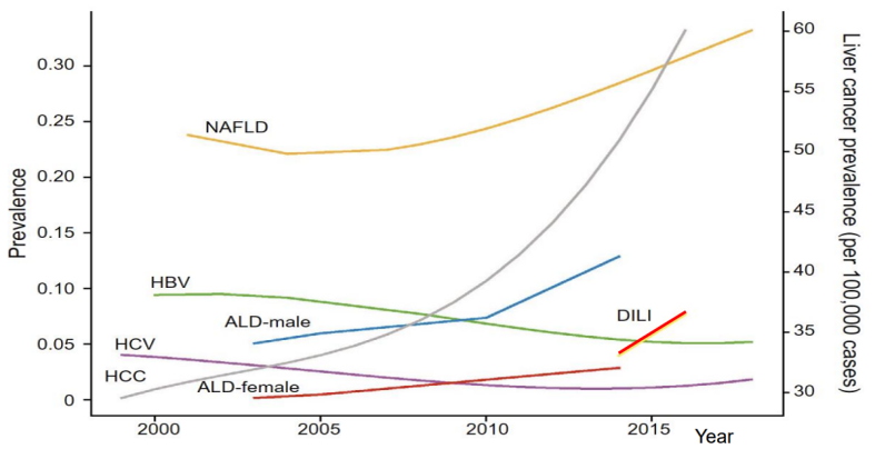 肝炎根据病因可分为病毒性肝炎和非病毒性肝炎,病毒性肝炎顾名思义即由多种病毒引起的;非病毒性肝炎则是由物理化学因素引起的,常与生活饮食习惯、自身免疫性疾病、酒精、药物和脂肪等因素有关。非病毒性肝炎常见的类型有酒精性肝炎、非酒精性脂肪肝炎、药物性肝炎和自身免疫性肝炎等。随着公共卫生条件的改善,疫苗的推广及抗病毒药物的普及,病毒性肝病的发病率呈下降趋势,而非病毒性肝病却呈上升趋势。非病毒性肝病的防治变得越来越重要。