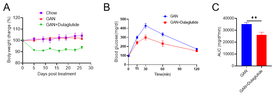 GAN饮食诱导的B-ob/ob小鼠NASH模型。(A)治疗下的体重变化。(B)治疗后的葡萄糖耐受能力。(C)B图曲线下的面积。数据以平均值±SEM表示。N=9 mice per group。*p<0.05, **p<0.01,***p<0.001。