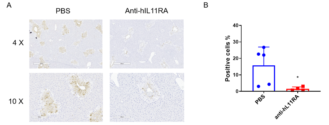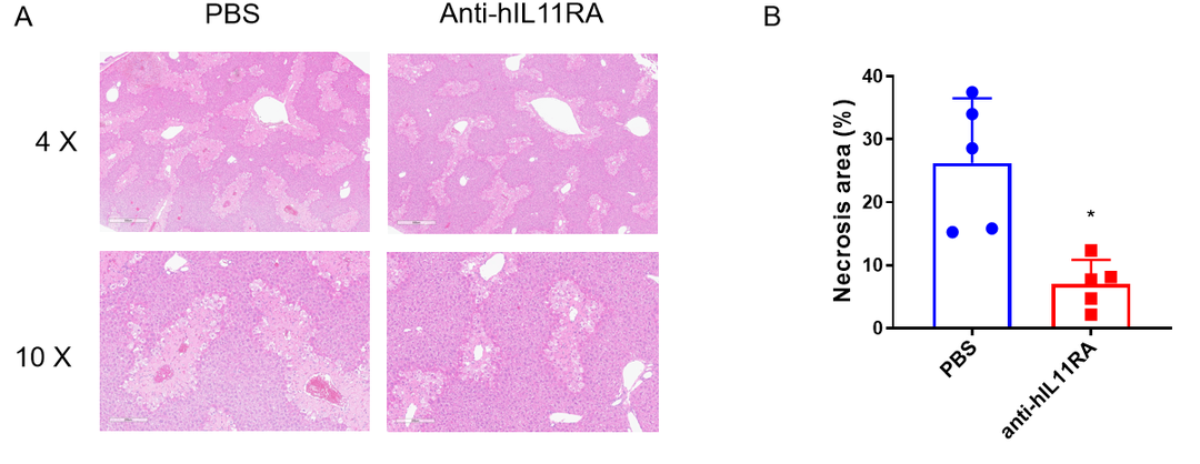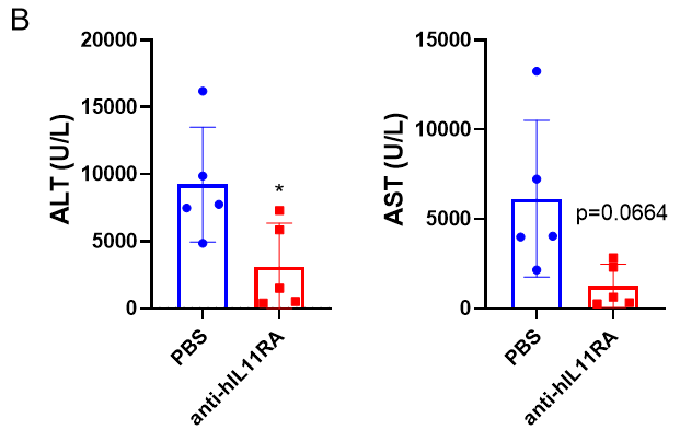 抗人IL11RA减轻APAP诱导的雄性B-hIL11RA小鼠肝损伤。(A)APAP诱导的B-hIL11RA小鼠(雄性,8周龄,n=5) 肝损伤的治疗剂量。用PBS/anti-hIL11RA (内部合成, 15 mg/kg)禁食过夜,并用APAP(400mg/kg)诱导24小时。收集血液和肝组织用于分析。(B)与对照组相比,抗hIL11RA抗体处理的雄性小鼠血清中ALT和AST水平降低。数值用平均值±标准差表示。*P<0.05。