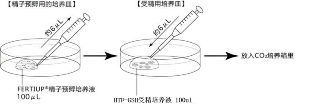 吸取有活力的精子加到提前备有卵子的受精液微滴中,皿放入培养箱至发育到受精卵或2cell。
