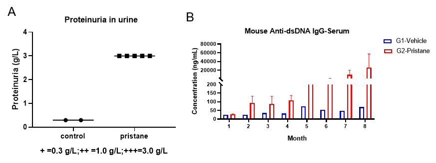 注射Pristane后,尿液中的蛋白尿 (A) 和血清中的小鼠抗 dsDNA IgG (B) 含量升高。