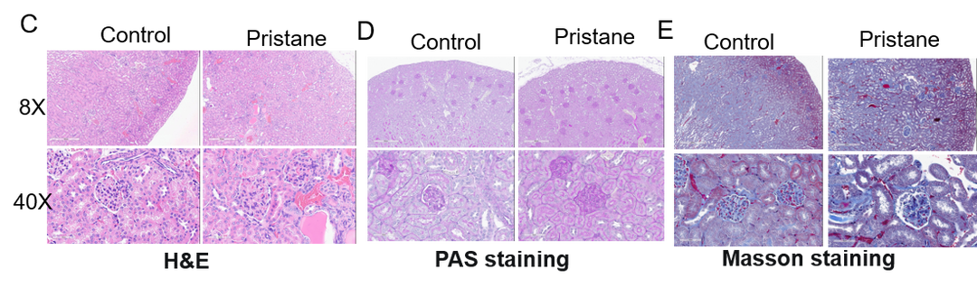 SLE模型肾脏的组织学分析。H&E染色(C)、PAS染色(D)、Masson染色(E)显示模型组肾小球基质细胞增生、肾小球硬化、蛋白管型及纤维化。