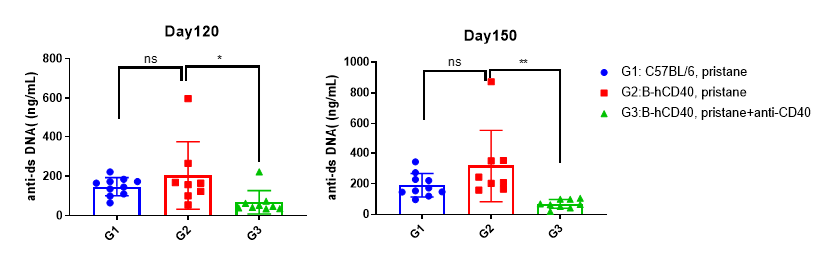 Pristane诱导的B-hCD40小鼠 SLE模型经抗 CD40 抗体处理后血清中小鼠抗 dsDNA IgG 含量降低。