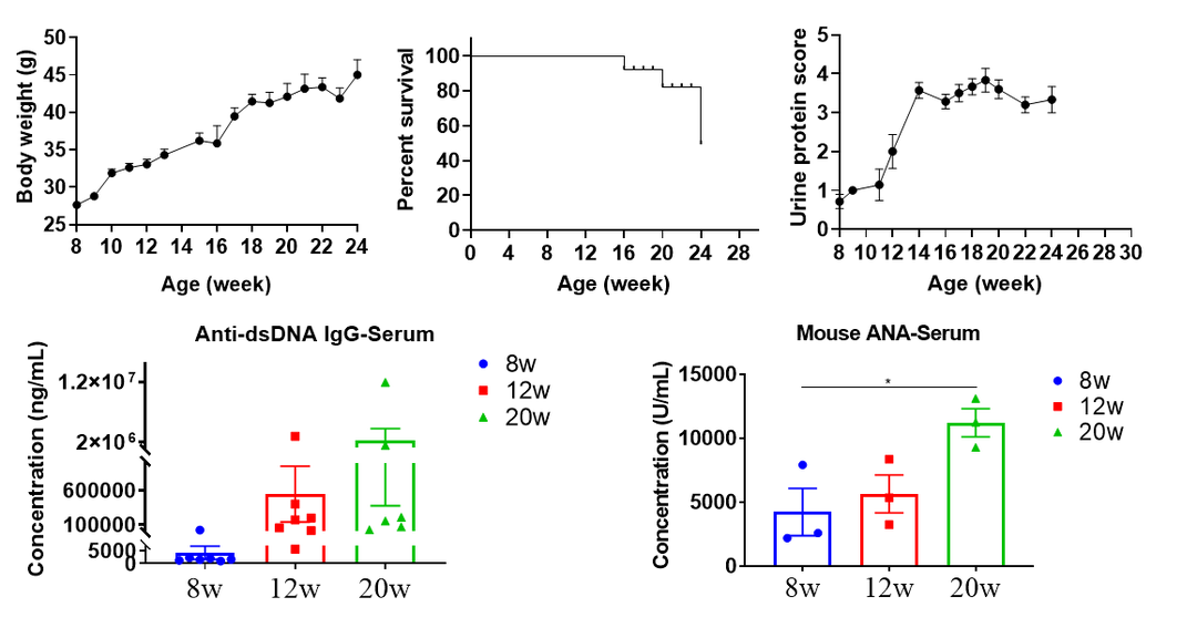 不同时间点体重、尿蛋白、生存曲线、血清抗dsDNA、ANA变化。