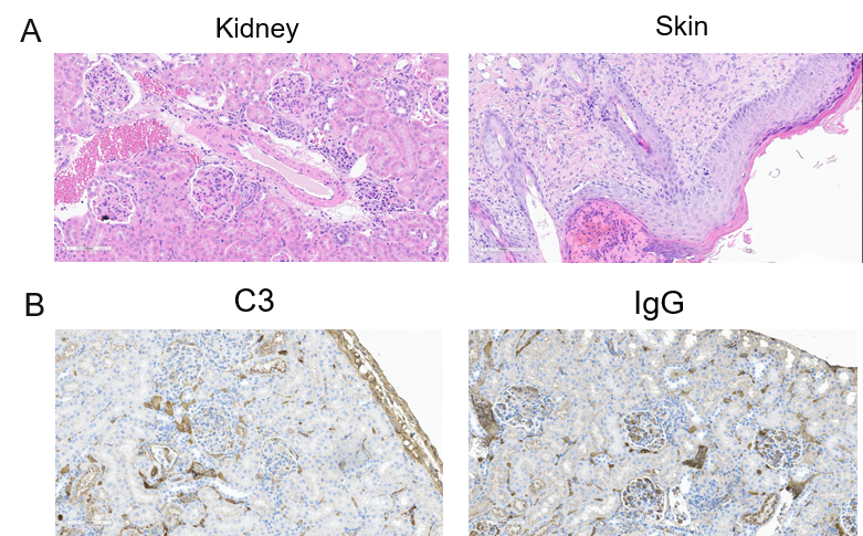 MRL/lpr小鼠自发SLE模型的肾脏组织学分析(20周龄)。A.肾脏可见肾小球肥大、肾小球细胞增生、基质增多;皮肤可见表皮细胞增生、表皮增厚、角化过度伴角化不足、真皮炎症细胞浸润。B.肾脏中C3和IgG沉积