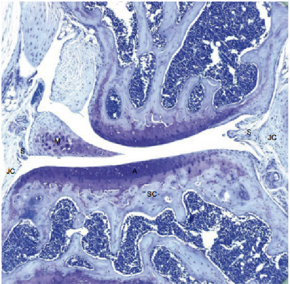 图2. 啮齿动物(小鼠)膝关节冠状切片,甲苯胺蓝染色[3]