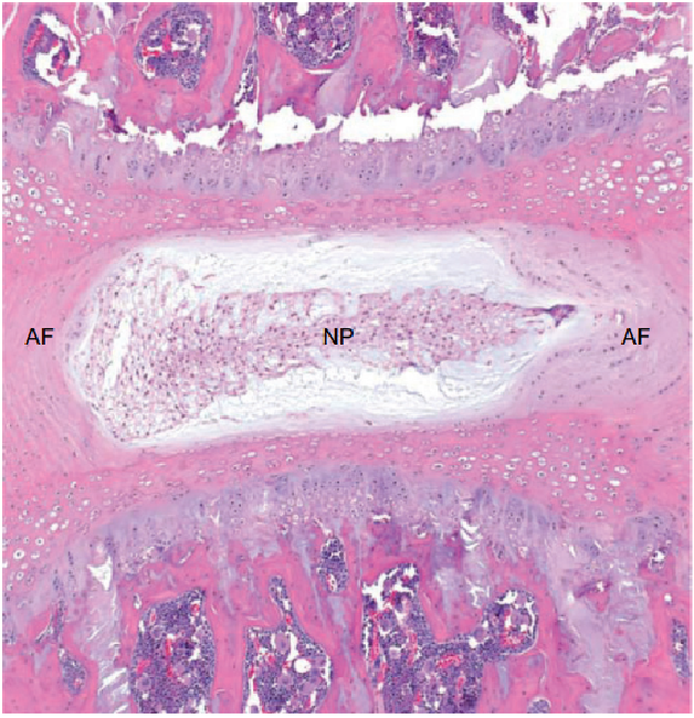 中央髓核(NP)包括疏松黏液状软骨基质。周围胶原环纤瘤(AF)附着在脊椎的软骨终板上。