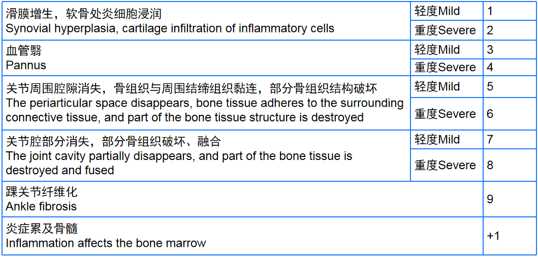 (a)炎细胞浸润;(b)滑膜增生;(c)血管翳;(d)骨组织损伤;(e)关节腔或关节周围腔隙消失