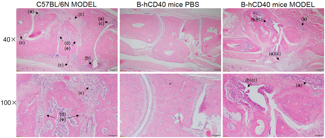 C57BL/6N野生鼠造模组和B-hCD40人源化鼠造模组四肢关节可见皮下混合炎细胞浸润,关节滑膜炎和/或血管翳形成,踝关节和/或趾骨关节软骨和骨组织破坏等关节炎病变,提示造模成功。B-hCD40人源化鼠造模较C57BL/6N野生鼠略轻。