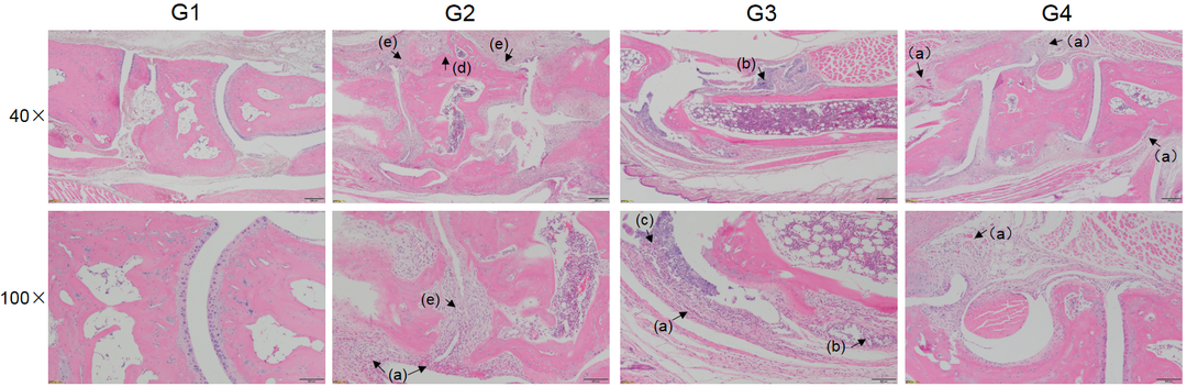 B-hIL6/hIL6R(V2)小鼠PBS对照组四肢关节未见明显病变,造模组G2四肢关节可见皮下混合炎细胞浸润,关节滑膜炎和/或血管翳形成,踝关节和/或趾骨关节软骨和骨组织破坏等关节炎病变,提示造模成功。受试品L6-sirukumab-IgG1在低剂量(G3)和高剂量(G4)时均对动物关节炎病变具有一定改善作用。